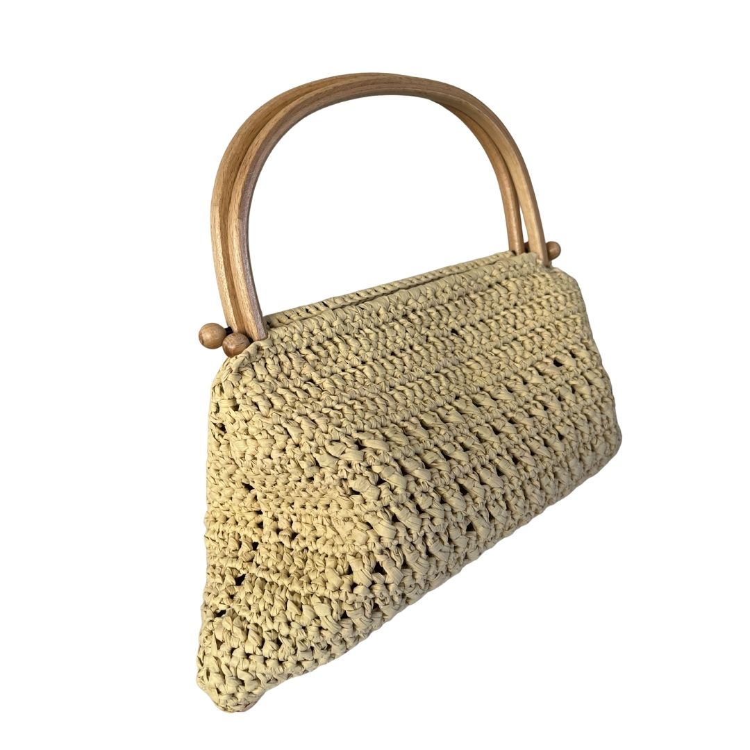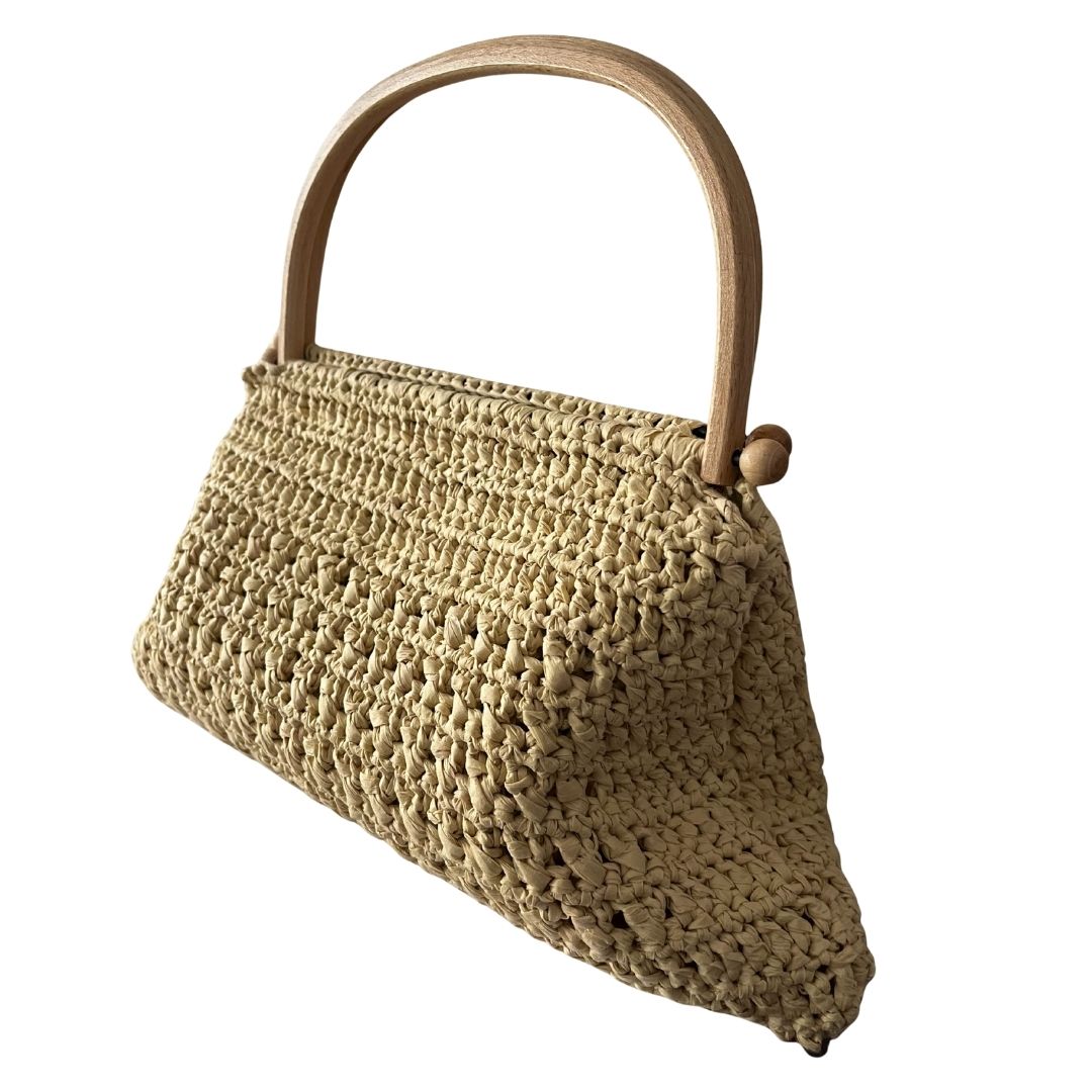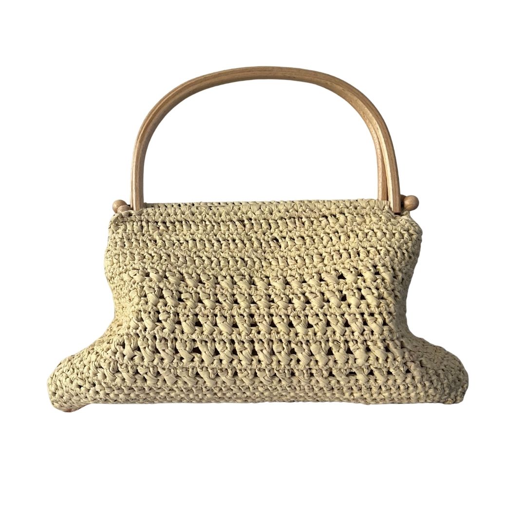 Rafya ipten üretilmiştir. El üretimidir. Taşıma sapı ahşap malzemedir. Çanta 35 cm (en) x 21 cm (boy) ölçülerindedir. Çanta sapının yüksekliği 11 cm dir. İç hacmi oldukça geniştir. Çantanın hiç bir bölümünde fermuar, çıt çıt vs metal materyal kullanılmamıştır. Tek gözlüdür. Çantanın içi saten kaplamadır. Çanta kombinlerin en önemli tamamlayıcı unsurlarındandır. Orta boy rafya çantanız gündüz ve gece her sezon her ortamda kullanıma uygundur. Vanilya rengi ile her kombinle uyumlu bir kullanıma sahiptir. Orta boyutu ve zarif motifi ile şıklığınızı bütünlemesi amaçlanmıştır.