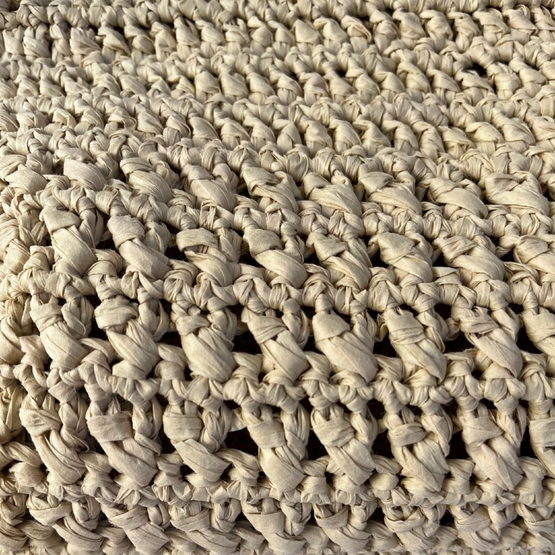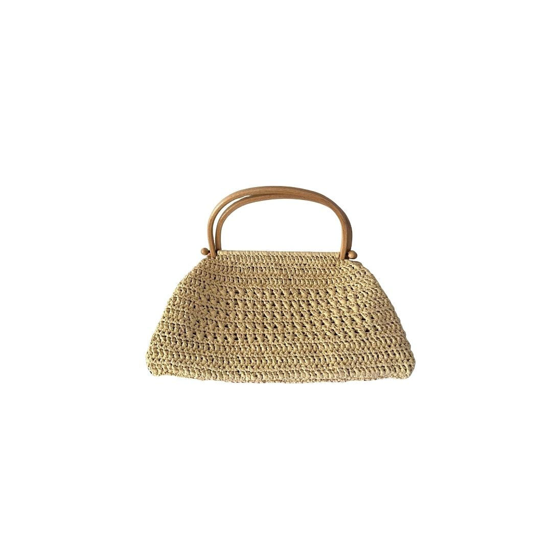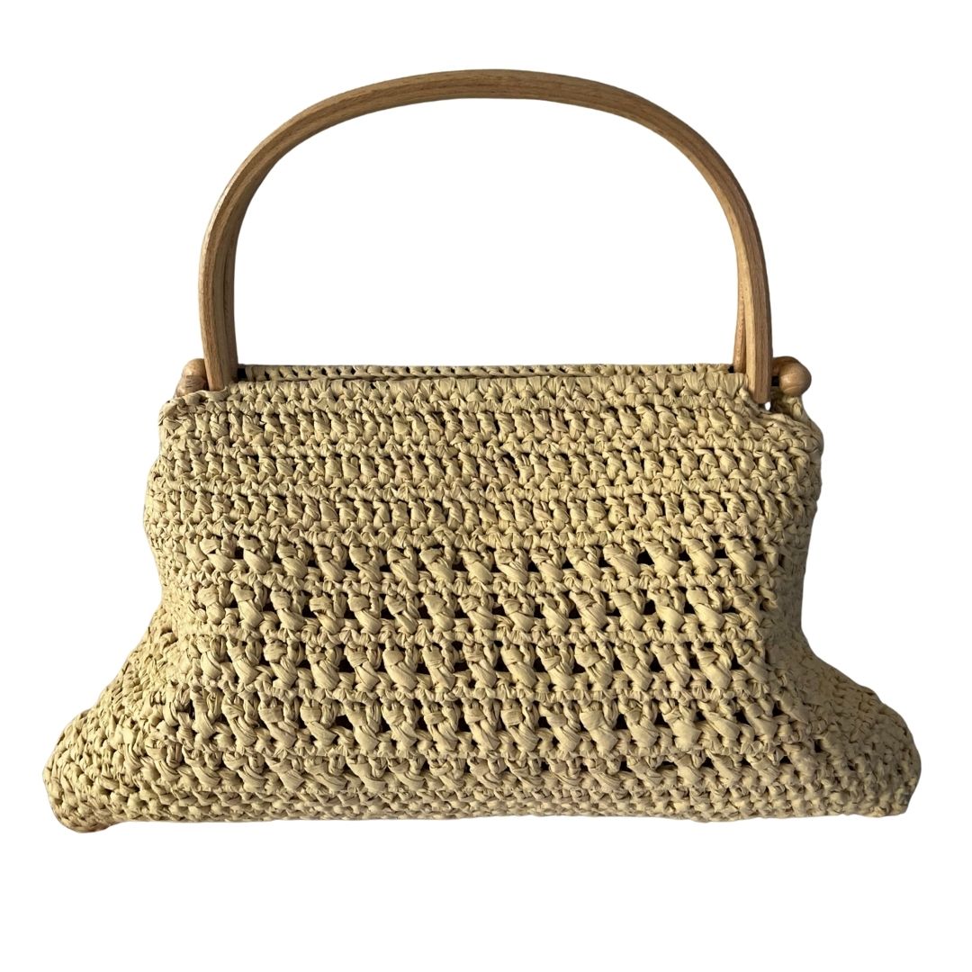 Rafya ipten üretilmiştir. El üretimidir. Taşıma sapı ahşap malzemedir. Çanta 35 cm (en) x 21 cm (boy) ölçülerindedir. Çanta sapının yüksekliği 11 cm dir. İç hacmi oldukça geniştir. Çantanın hiç bir bölümünde fermuar, çıt çıt vs metal materyal kullanılmamıştır. Tek gözlüdür. Çantanın içi saten kaplamadır. Çanta kombinlerin en önemli tamamlayıcı unsurlarındandır. Orta boy rafya çantanız gündüz ve gece her sezon her ortamda kullanıma uygundur. Vanilya rengi ile her kombinle uyumlu bir kullanıma sahiptir. Orta boyutu ve zarif motifi ile şıklığınızı bütünlemesi amaçlanmıştır.
